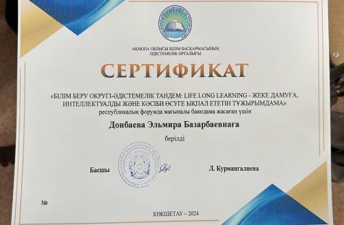 2024 жылдың 30 қазан күні Астрахан ауданы, Астраханка ауылында «Білім беру округі-Әдістемелік тандем: Life long learning- жеке дамуға, интеллектуалды және кәсіби өсуге ықпал ететін тұжырымдама» тақырыбындағы аймақтық форумға «Ақмола облысы білім басқармасының Целиноград ауданы бойынша білім бөлімінің жанындағы Қажымұқан ауылының «Қошақан» бөбекжайы» МКҚК-нің әдіскері Донбаева Элмира Базарбаевна қатысып өз тәжірибесімен бөлісіп, сертификатқа ие болды.