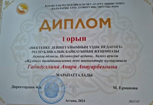 26-қыркүйек күні Қарағанды қаласында өткен "Тәрбиелеу мен оқытудың заманауи нысандары мен әдістері: ізденістер мен шешімдер" атты құзыреттілік орталықтары мен мобильді топтардың өңірлік семинарында Ақмола облысы Целиноград ауданы Ақмол ауылы Жұлдыз балабақшасының дене шынықтыру нұсқаушысы А.А Габидуллина «Үздік педагог» республикалық байқауының жеңімпаздарын марапаттау рәсімінде жүлделі 126-қыркүйек күні Қарағанды қаласында өткен "Тәрбиелеу мен оқытудың заманауи нысандары мен әдістері: ізденістер мен шешімдер" атты құзыреттілік орталықтары мен мобильді топтардың өңірлік семинарында Ақмола облысы Целиноград ауданы Ақмол ауылы Жұлдыз балабақшасының дене шынықтыру нұсқаушысы А.А Габидуллина «Үздік педагог» республикалық байқауының жеңімпаздарын марапаттау рәсімінде жүлделі 1 орынды иеленді. Құттықтаймыз!