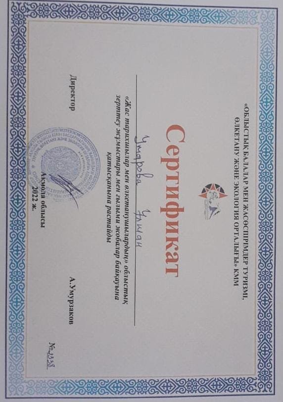 2022 жылдың 06-08 сәуір күндері аралығында Щучинск қаласы, Жоғары педколледж базасында өткізілген облыстық Жас тарихшылар мен өлкетанушылардың зерттеу жұмыстары мен ғылыми жобалар байқауында ауданымыздан қатысқан, Тайтөбе ауылы ЖББОМ 10-сынып оқушысы Умарова Ұлжан...