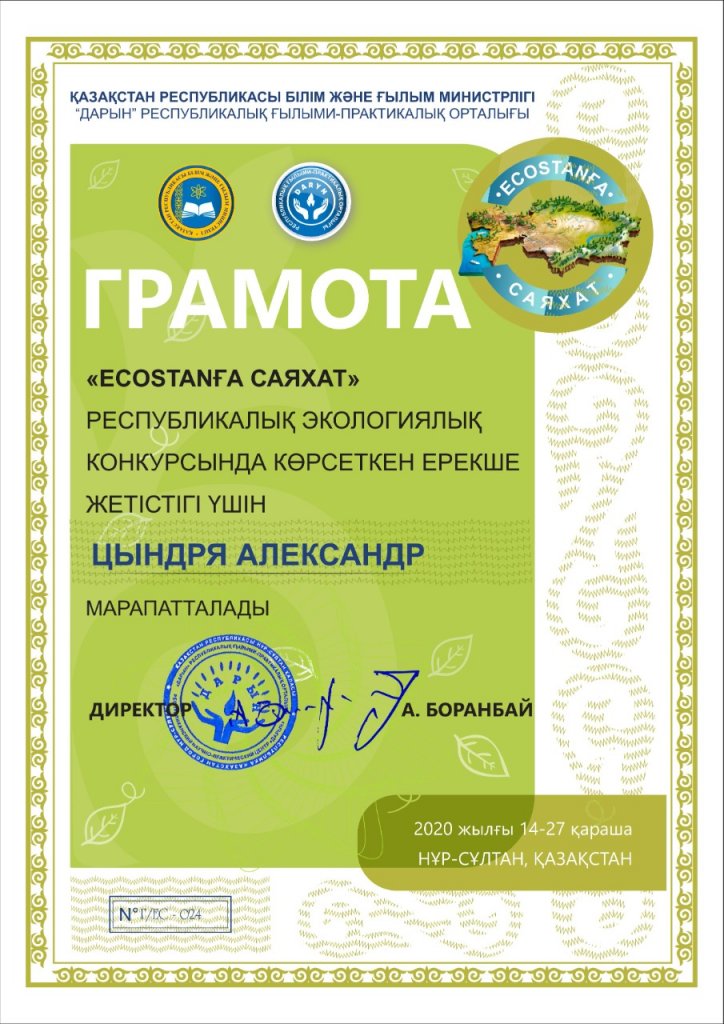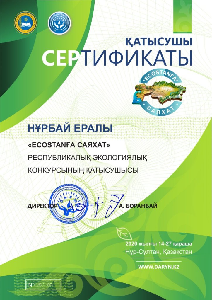 2020-2021 оқу жылының қараша айында «ECOSTAN-ға САЯХАТ» республикалық экологиялық конкурсының Ақмола облысы Целиноград ауданынан Республикалық онлайн байқауға 7-8 сыныптар арасында Жаңажол ауылы №7 негізі мектебінің 8-сынып оқушысы Нұрбай Ералы Жанатұлы ең үздік натуралистік фоторепортаж және 9-12 сыныптар арасында ең үздік экологиялық бейнебаян бағытында Родина ауылы №33 орта мектебінің 9-сынып оқушысы Цындря Александр жұмыстары өтіп, мадақтама қағазы, сертификатпен марапатталды. Нұрбай Ералы байқай номинациясы: «Экалогия және адам», Цындря Александр «Адам және жануарлар әлемі:келісім мен үйлесімдігі өмір» тақырыбында өз жұмыстарымен бөлісті. Өрендерімізге әрқашан сәттілік серік болсын !!!
