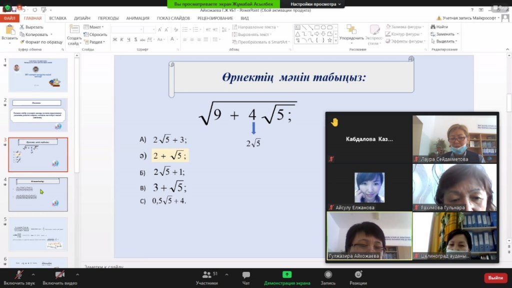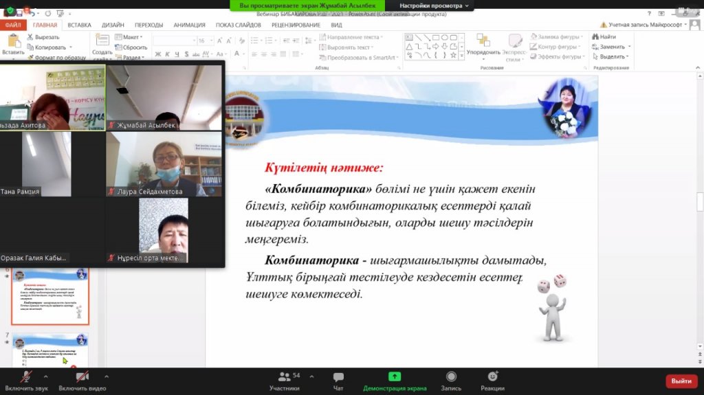 Мектебіміздің мұғалімдері ҰБТ-не оқушыларды дайындау барысында кездесетін қиындықтар,оларды шешу мәселелерімен бөлісіп,өз іс-тәжірибелерімен бөлісті. Вебинар соңында басқа да мектептердің мұғалімдері оқушыларды ҰБТ-не дайындау барысында кездесетін кейбір мәселелерді шешу жөнінде өз ойларымен бөлісті, атап айтатын болсақ Арайлы ауылы мектебінің математика пәні мұғалімі Жакенова Л.Ж. , алдыңғы уақытта вебинарды тек бір тақырыпқа негіздеп алуды ұсынса, Л.Қ. Сейдахметова логикалық есептерді шешуге көбірек көңіл бөлуді ұсынды.