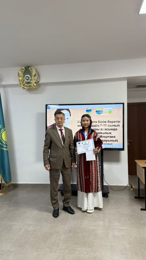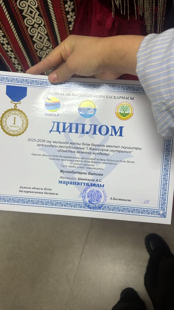 1 дәрежелі диплом «Сұлу сөздің сүлейі» бағыты бойынша Муханбетқали Бәтима – Талапкер ауылының жалпы білім беретін мектебінің 11 сынып оқушысы жетекшісі Шантасов Айболат;