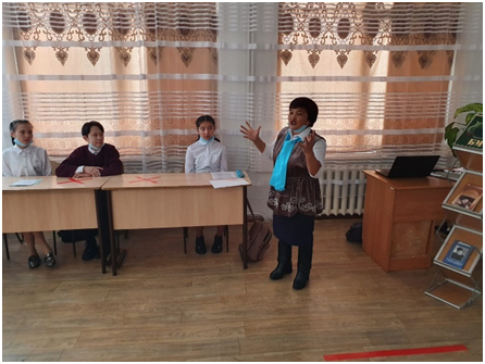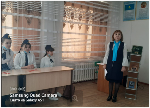 Сабақта Б.Момышұлының «Соғыс тактикасы» тақырыбында баяндама оқылып, балалар Б.Момышұлының қанатты сөздерін жатқа айтып,мән- мағынасын аша білді.Сабақ соңы Б.Момышұлының баласына айтқан өсиет сөздермен аяқталды. Көрермендер дән риза болып, тарасты.