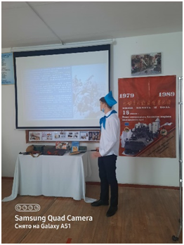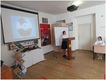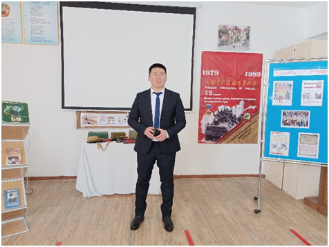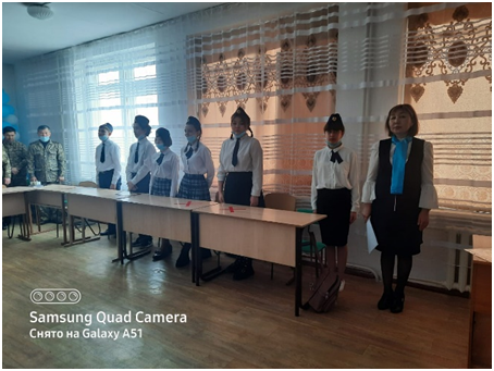 Рустемова Гулден Алпысовна 7 «Б» сыныбында Ауған соғысында қаза тапқан адамдарға тағзым етіп, оқушының бойына ерлік,күш- жігер қасиеттерін дарыта білді. «Адамгершілік- рухани тәрбие негізі» тақырыбында Бауыржан Момышұлының қанатты сөздері арқылы өскелең ұрпақты елін, жерін сүюге тәрбиелеу сахна саңлақтары «Отырардың күйреуі» дастанын көпшілікке көрсетті. Келген қонақтар риза болысты. Іс-шараны жүргізген тәжірибелі ұстаз Айдарбекова Айгүл Бахирқызы.