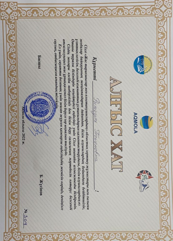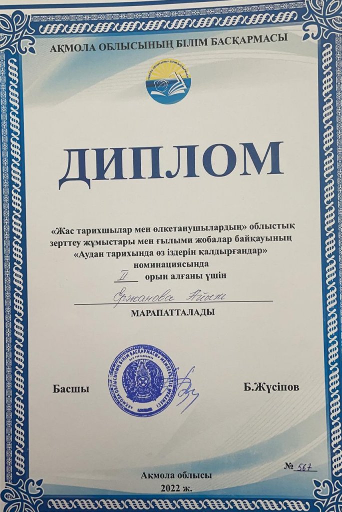 2022 жылдың 06-08 сәуір күндері аралығында Щучинск қаласы, Жоғары педколледж базасында өткізілген облыстық Жас тарихшылар мен өлкетанушылардың зерттеу жұмыстары мен ғылыми жобалар байқауында ауданымыздан қатысқан, Тайтөбе ауылы ЖББОМ 10-сынып оқушысы Умарова Ұлжан «Ескерткіштер – Ел тарихы» номинациясы бойынша және Қосшы қ.Р.Қошқарбаев атындағы №1 ЖББОМ 9-сынып Ержанова Айым «Аудан тарихында өз іздерін қалдырғандар» номинациясында 2_орынды жеңіп алды. Қоянды ауылы №1 ЖББОМ 8-сынып оқушысы Бухат Аружан байқауға қатысушы сертификатымен марапатталды. Жеңіске жеткен өрендерімізді құттықтаймыз!