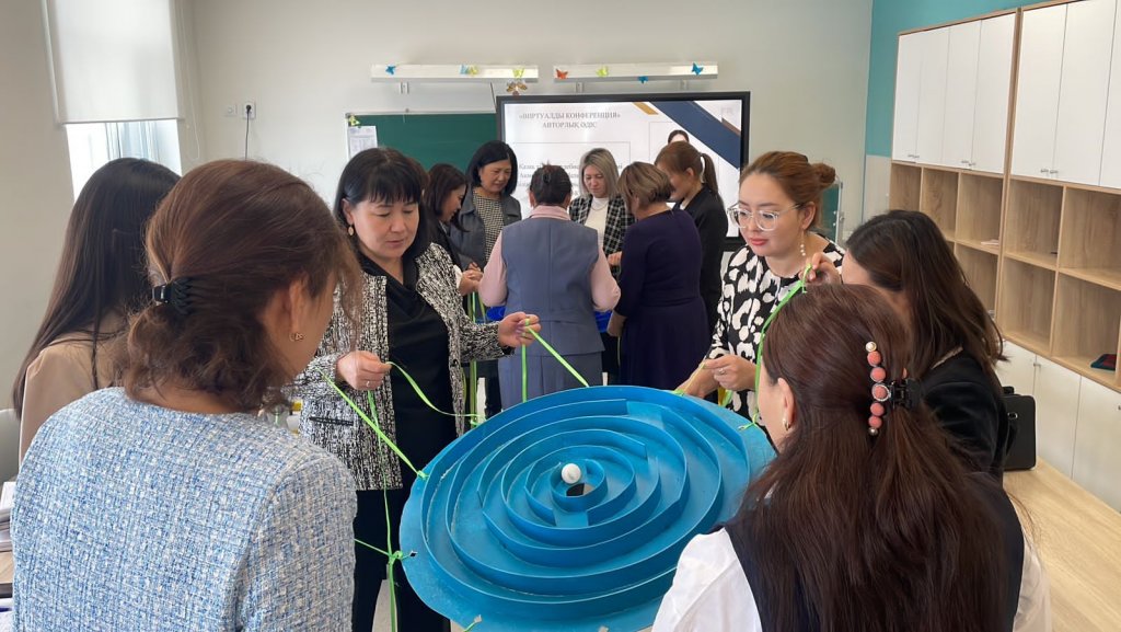 Асия Нурлановна «Виртуалды конференция» авторлық әдісі бойынша шебер сағат көрсетті. Осы конференцияда модератор Асия Нурлановна өзінің авторлық жұмысы «Виртуалды конференция» әдісімен бөлісті. Әдістің жаңашылдығы: конференцияны виртуалды өткізу, оқушылар арасында желілік қоғамдастық орнату, цифрлы конференция өткізуде оқушы бойында зияткер жеке тұлғаны қалыптастыру. Мусина Асия Нурлановна әдістің қолдану, өткізу формасын, тиімділігін жан-жақты баяндап конференция қонақтарына «кәде сый» кюарланған карточкасын ұсынды. Бұл «кәде сыйында» осы авторлық әдістің қолдану жолдары толық көрсетілген.