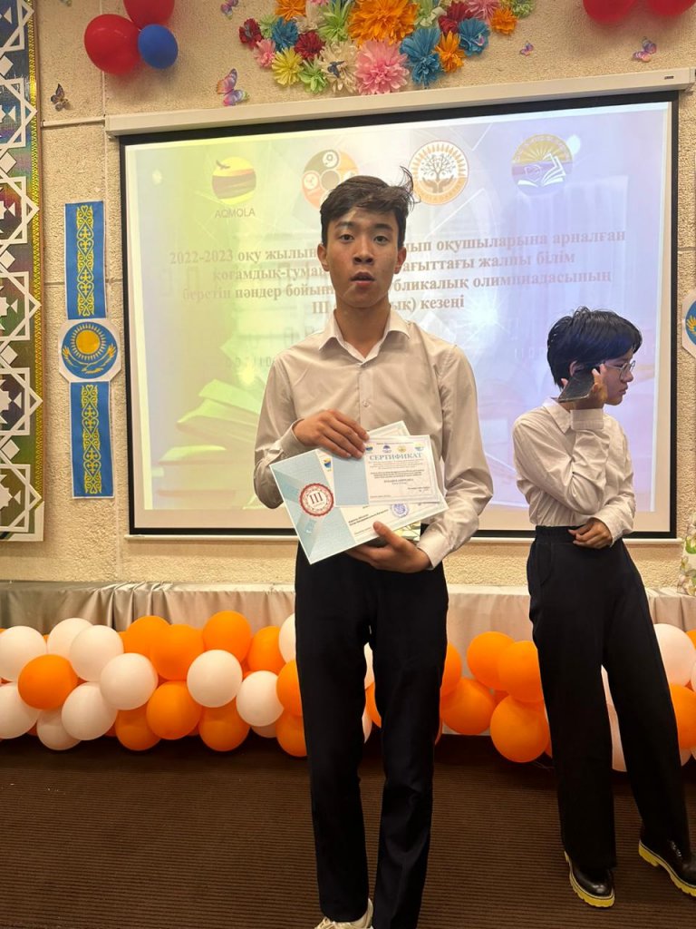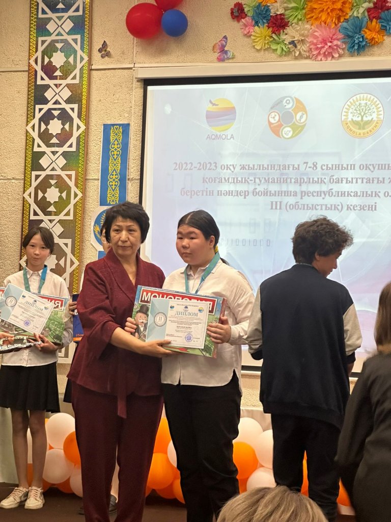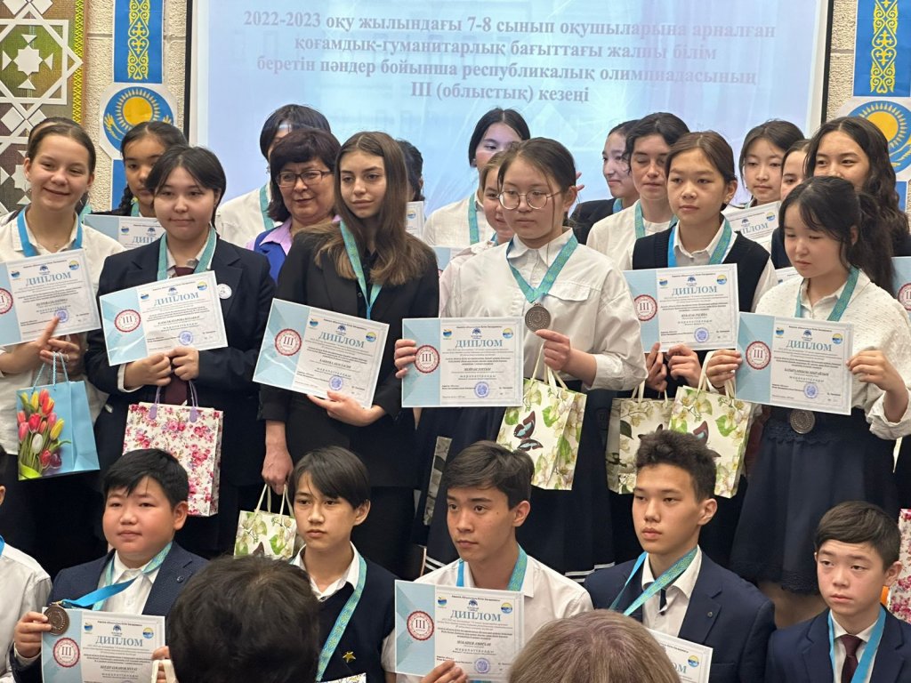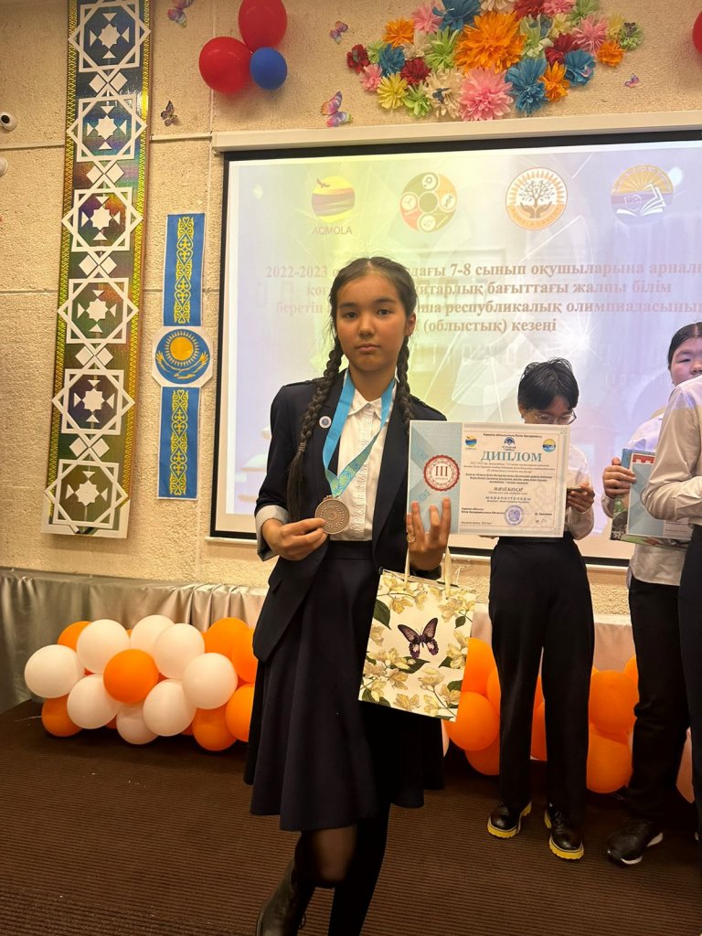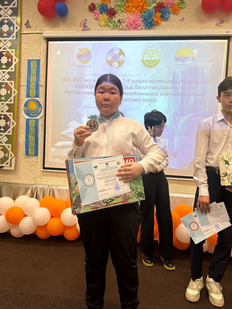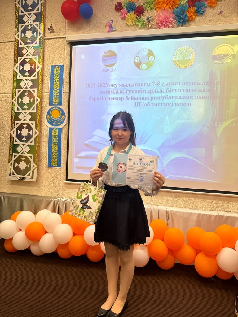 Батырханқызы Шырайлым, ученик 8 класса общеобразовательной школы №1 села Коянды, занял 3 место по историй Казахстана на областном этапе республиканской олимпиады по общеобразовательным предметам для 7-8 классов.