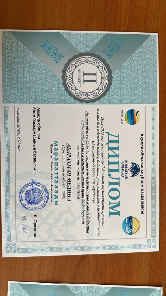 Абрахман Медина, ученик 7 класса общеобразовательной школы села Акмол, занял 2 место по русский язык и литературе (русский) на областном этапе республиканской олимпиады по общеобразовательным предметам для 7-8 классов.