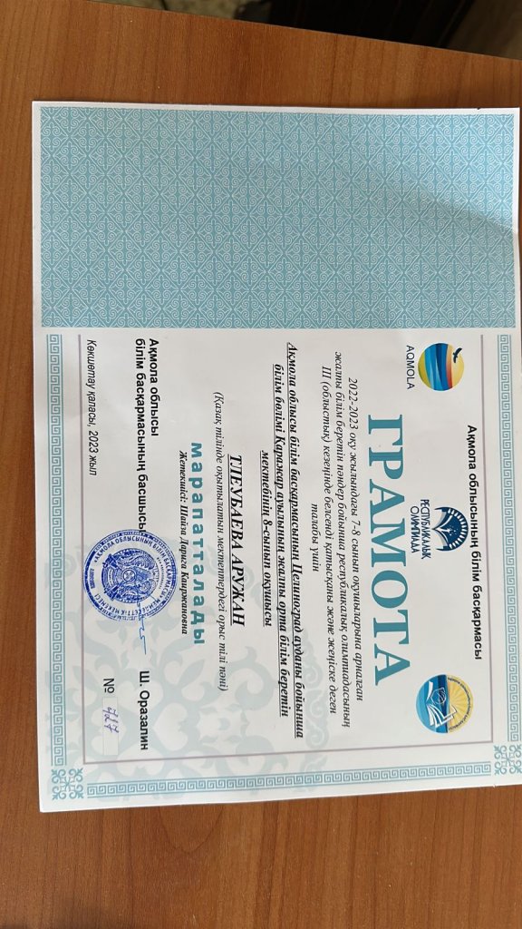 Тлеубаева Аружан, ученик 8 класса общеобразовательной школы села Каражар, заняла грамоту по русский язык и литературе на областном этапе республиканской олимпиады по общеобразовательным предметам для 7-8 классов.
