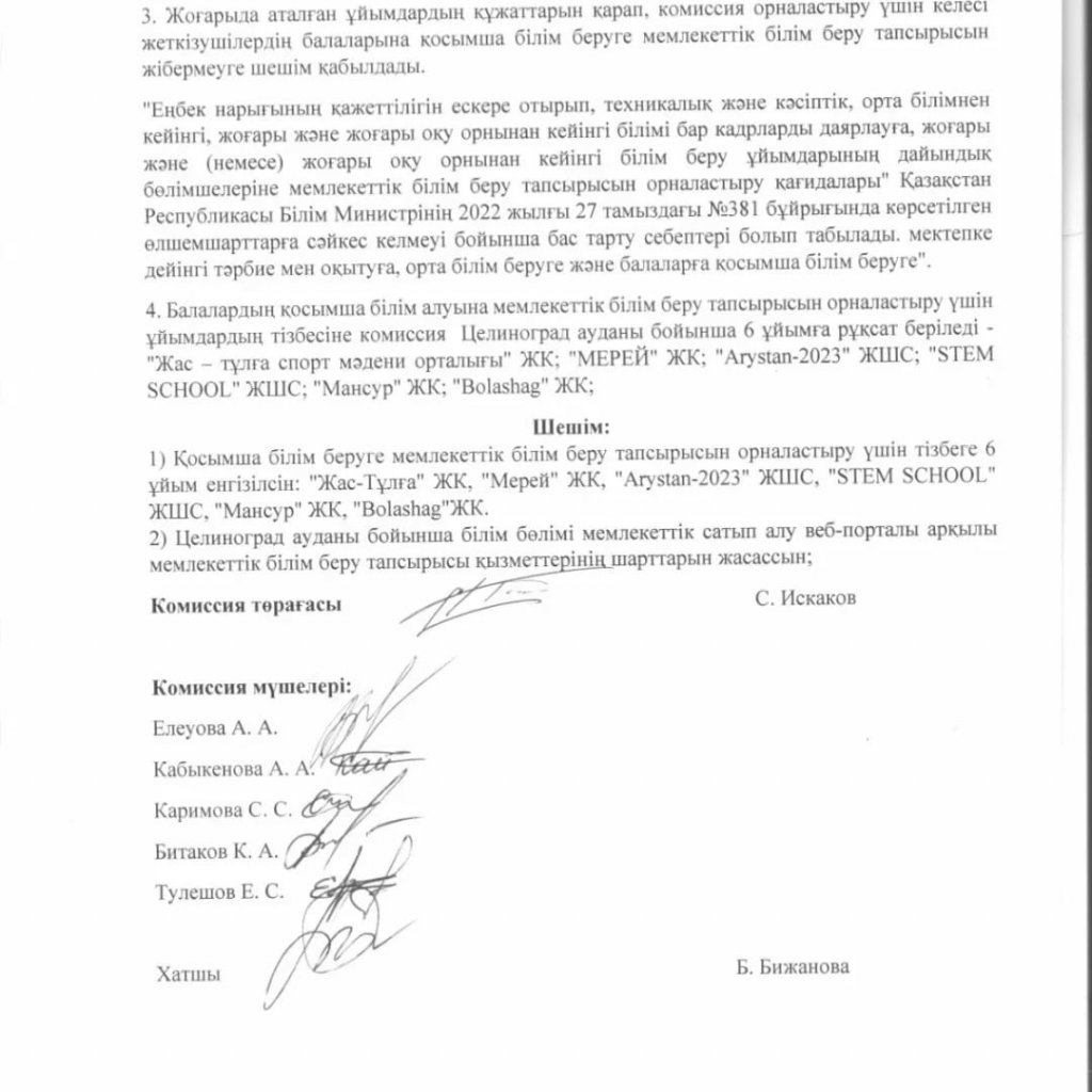 4. Балалардың қосымша білім алуына мемлекеттік білім беру тапсырысын орналастыру үшін ұйымдардың тізбесіне комиссия Целиноград ауданы бойынша 6 ұйымға рұқсат беріледі - "Жас – тұлға спорт мәдени орталығы" ЖК; "МЕРЕЙ" ЖК; "Arystan-2023" ЖШС; "STEM SCHOOL" ЖШС; "Мансур" ЖК; "Bolashag" ЖК;