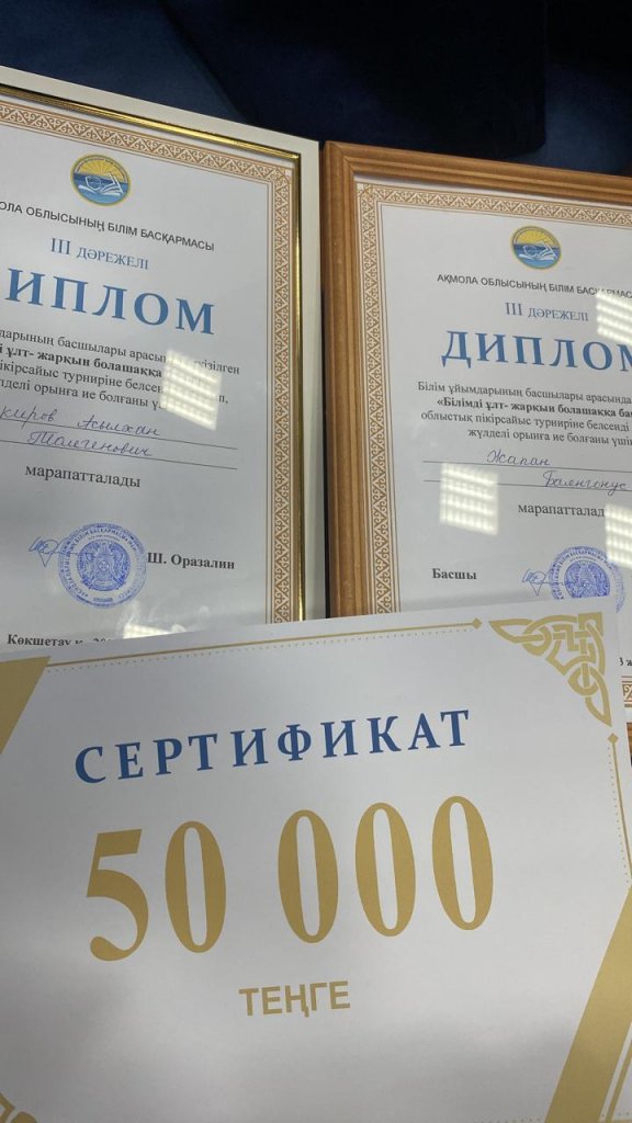 2023 жылдың 17 қараша күні Бурабай ауданы, Щучинск қаласы, №7 мектеп-лицейде өткен білім беру ұйымдарының директорлары арасында «Білімді ұлт – жарқын болашаққа бағдар» III облыстық пікірсайыс турниріне Целиноград ауданының атынан Төңкеріс ауылының орта мектебінің директоры Шакиров Асылхан Толегенович және Жаңажайнақ ауылының орта мектебінің директоры Жапан Баянгонус қатысып, командалық есепте жүлделі 3-орынға ие болып, 50 мың теңге сертификатымен марапатталды. Жеңістеріңіз құтты болсын!