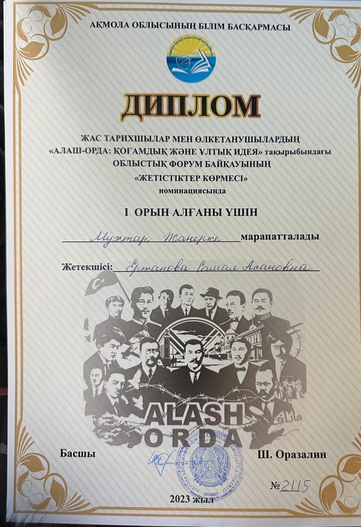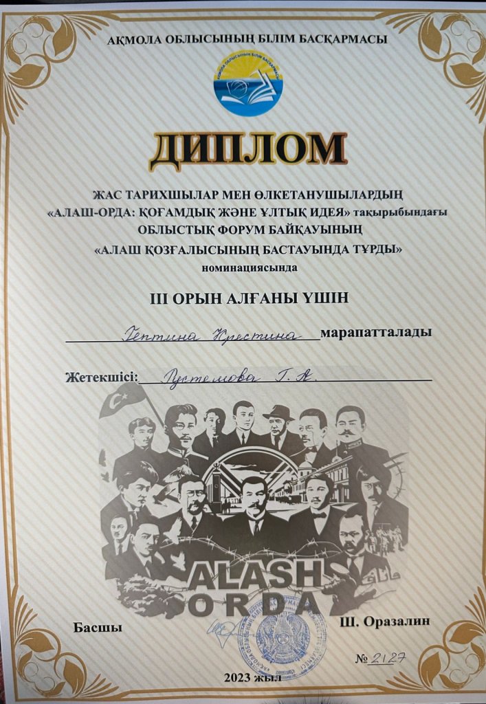 ➢ Жас тарихшылар мен өлкетанушылардың «Алаш-орда: қоғамдық және ұлттық идея» тақырыбындағы облыстық форум байқауының «Алаш қозғалысының бастауында тұрды» номинациясында Гептина Кристина III орынды иеленді;