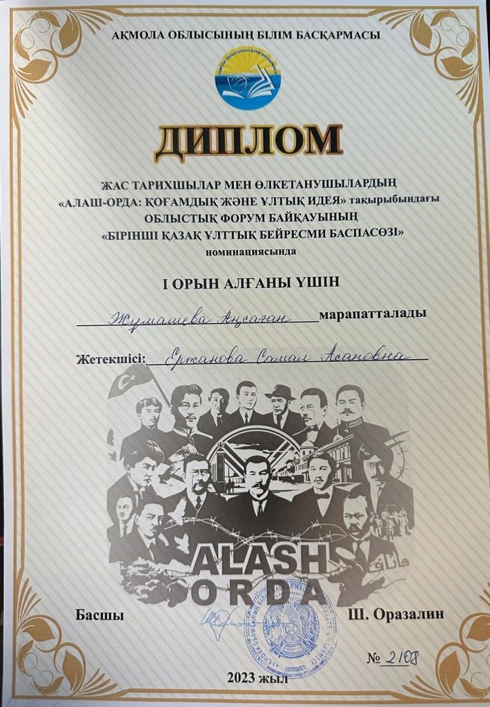 ➢ Жас тарихшылар мен өлкетанушылардың «Алаш-орда: қоғамдық және ұлттық идея» тақырыбындағы облыстық форум байқауының «Бірінші қазақ ұлттық бейресми баспасөзі» номинациясында Жұмашева Аңсаған І орын алды;